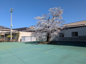 晴天でポカポカ陽気で全く寒く無かったです。いつもであれば体育館で寒い時間を過ごしますが、下駄箱前の桜が満開でした。